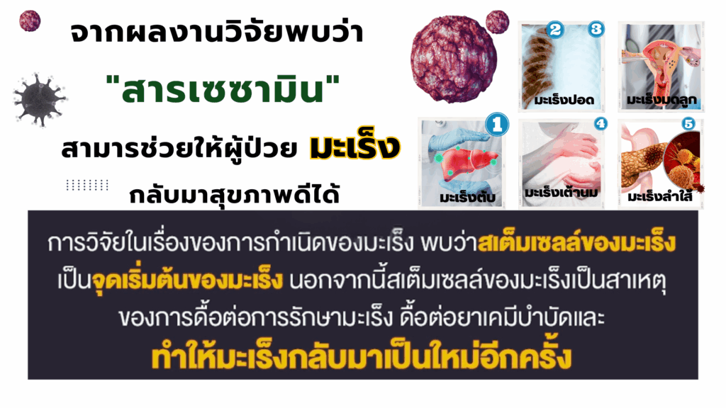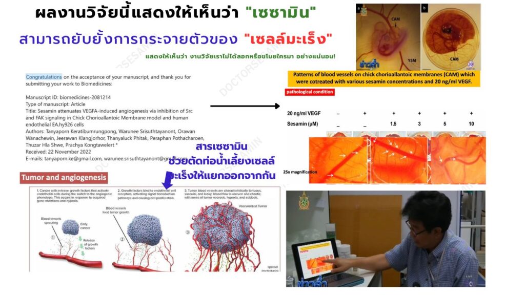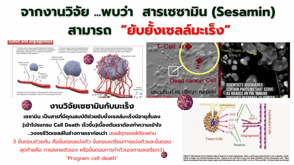 – เซซามิน สามารถไปบล็อกการสร้างเส้นเลือดเหล่านั้น ทำให้เซลมะเร็งขาดอาหาร จนฝ่อ เหี่ยว และหลุดออกไป (อดอาหารตาย)