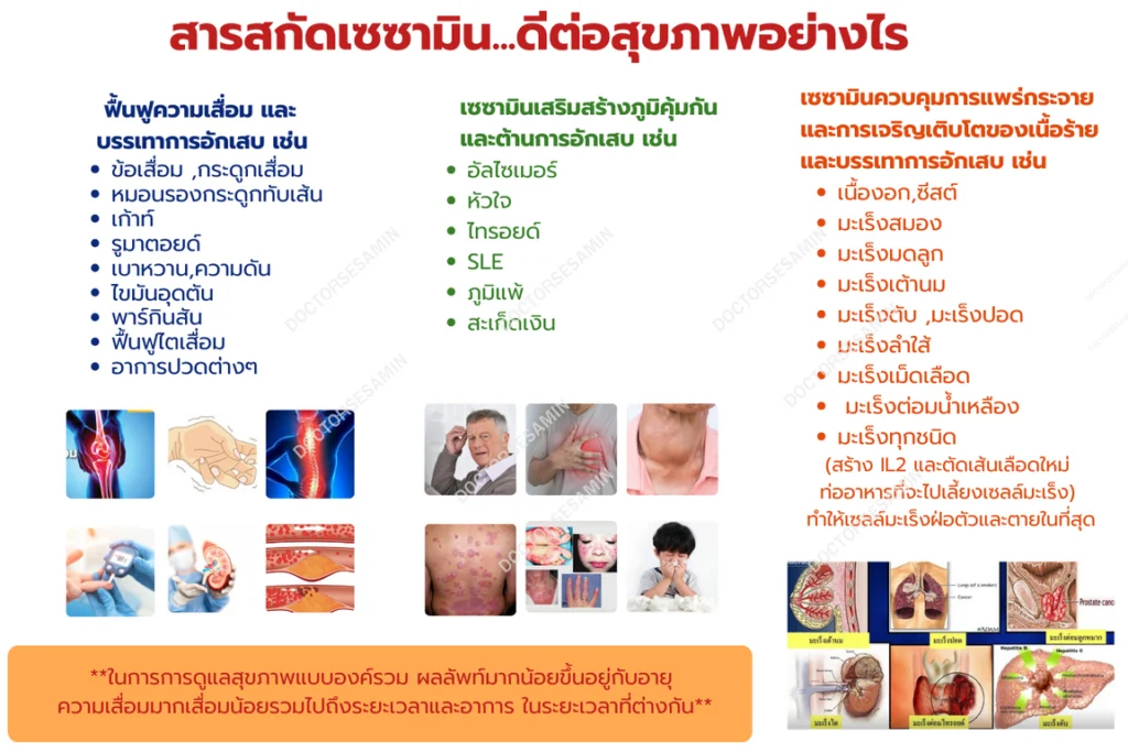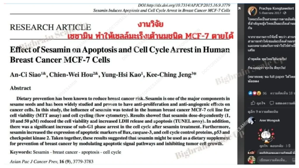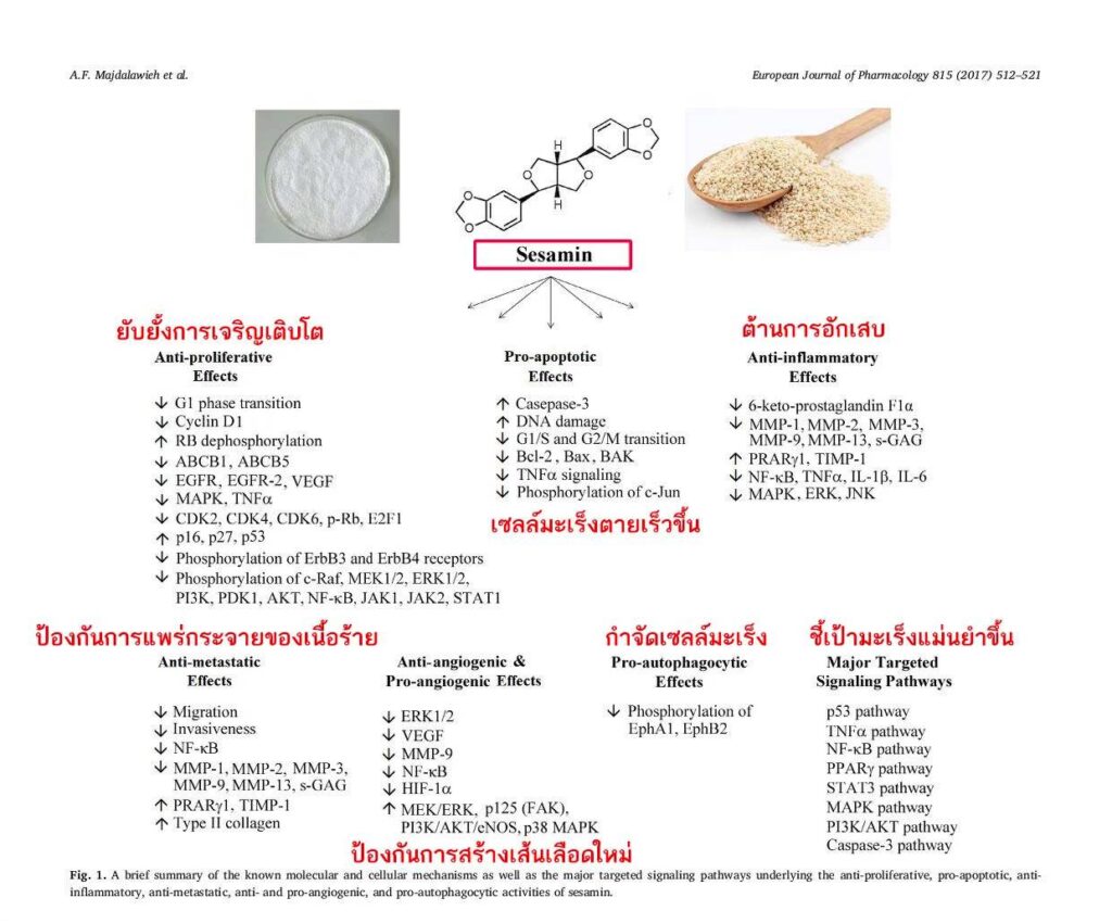 – เซซามิน เข้าไปแก้ไขกระบวนการนี้ให้มะเร็งเข้าสู่กระบวนการ cell death ดังนั้น เมื่อได้รับสารเซซามิน มะเร็งก็จะเข้าสู่กระบวนการตายอย่างรวดเร็วเช่นกัน